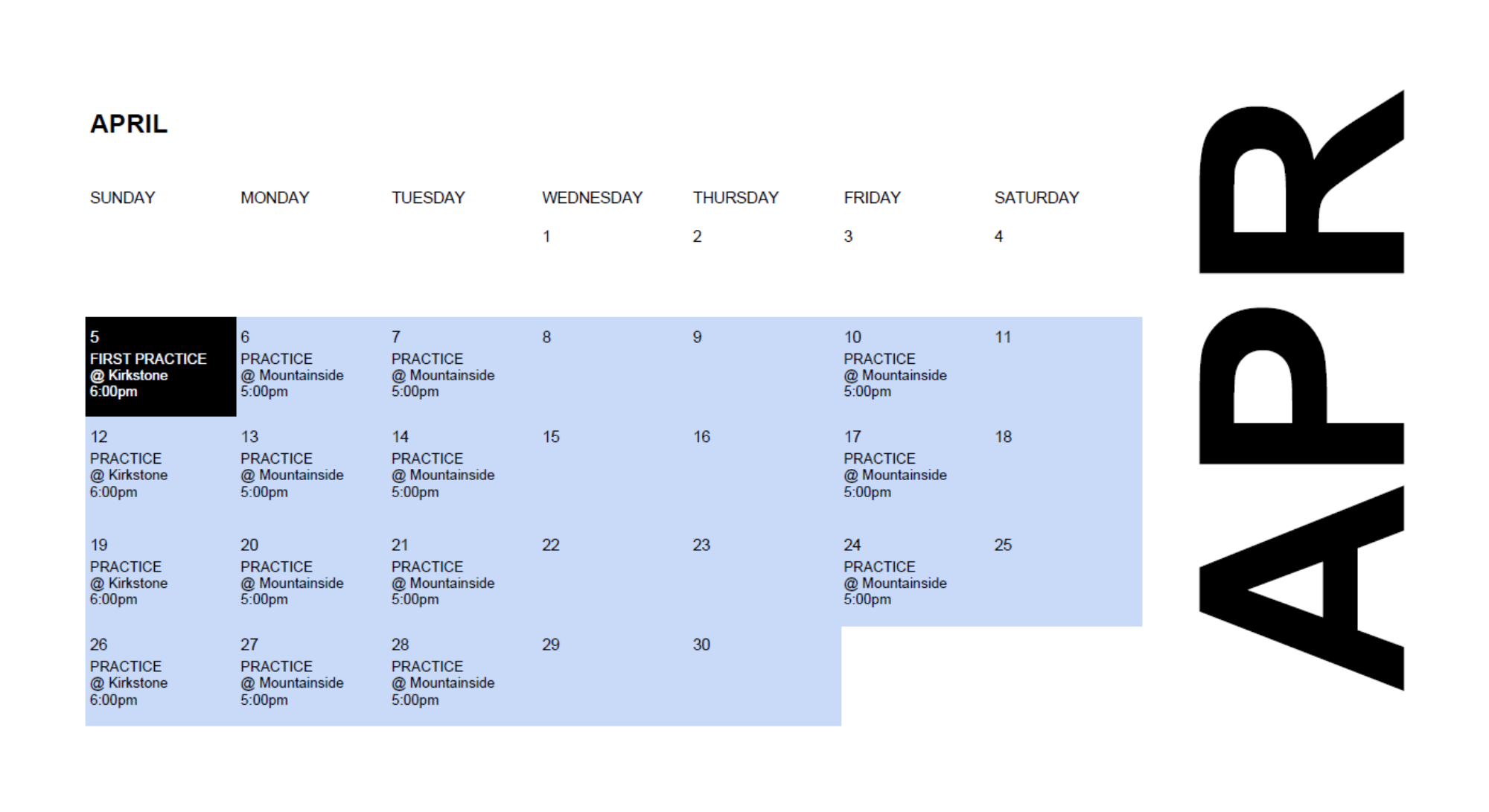 - April 5th: First pre-season practice (Kirkstone, 6:00pm)