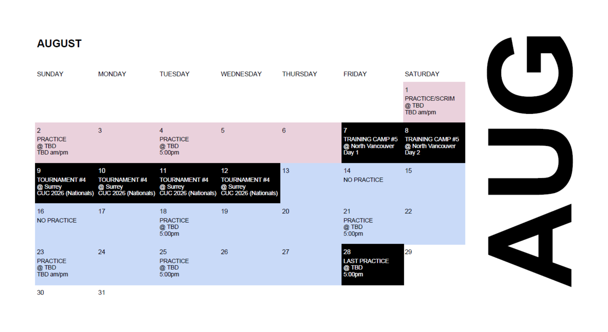 - August 7th & 8th: Our Touring team will host Scorch for a two-day training camp (Friday & Saturday) prior to attending CUC, if we earned a bid