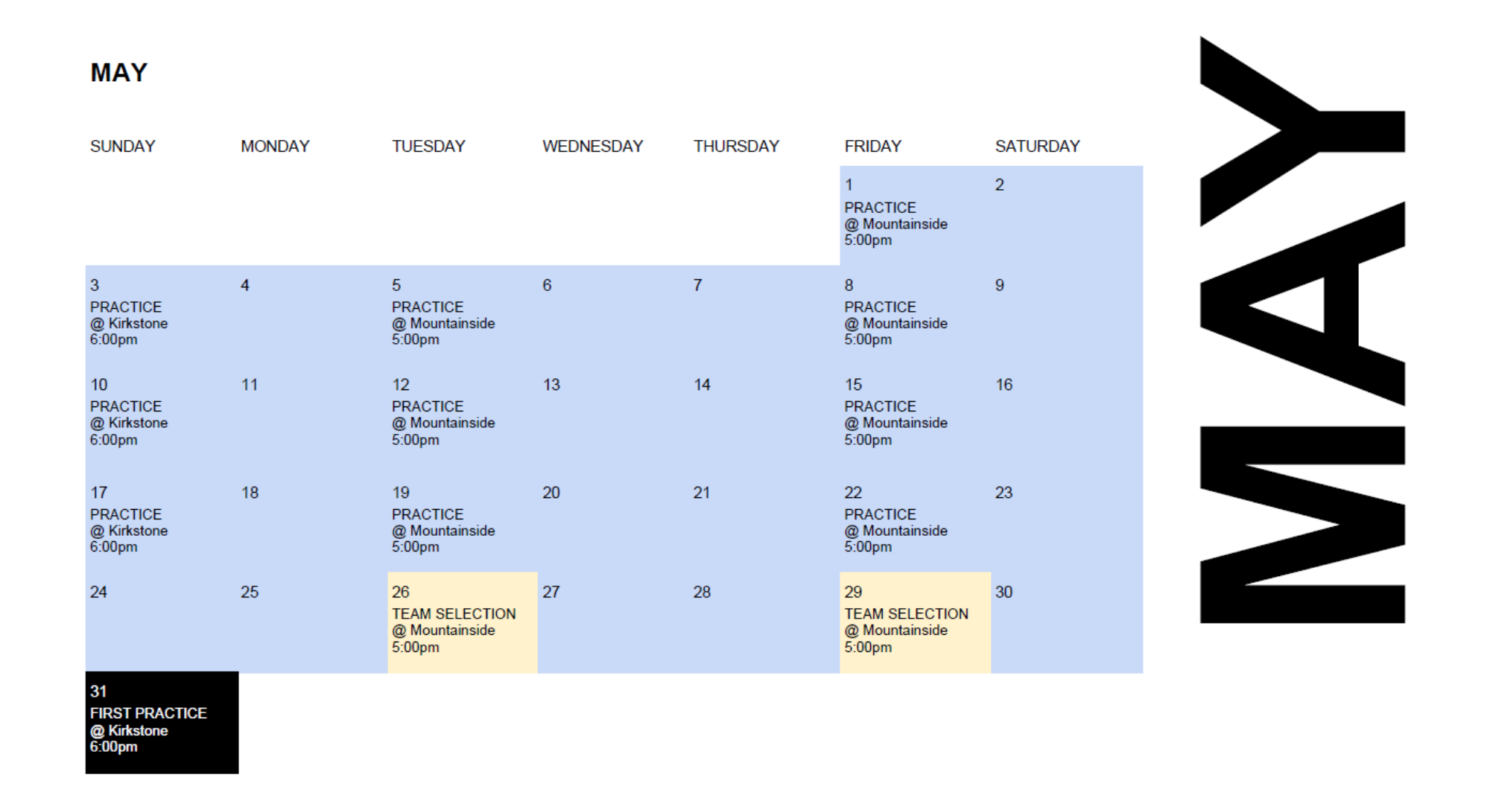 - May 22nd: Last practice of pre-season
